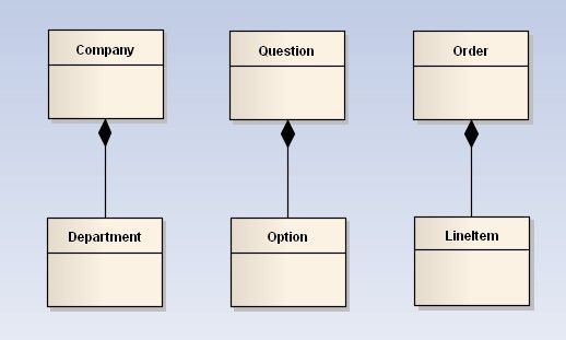组合(Composition) : 表示contains-a的关系,是一种强烈的包含关系。组合类负责被组合类的生命周期。是一种更强的聚合关系。部分不能脱离整体存在。如公司和部门的关系,没有了公司,部门也不能存在了;调查问卷中问题和选项的关系;订单和订单选项的关系。在类图使用实心的菱形表示,菱形从局部指向整体。![]()