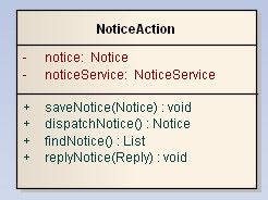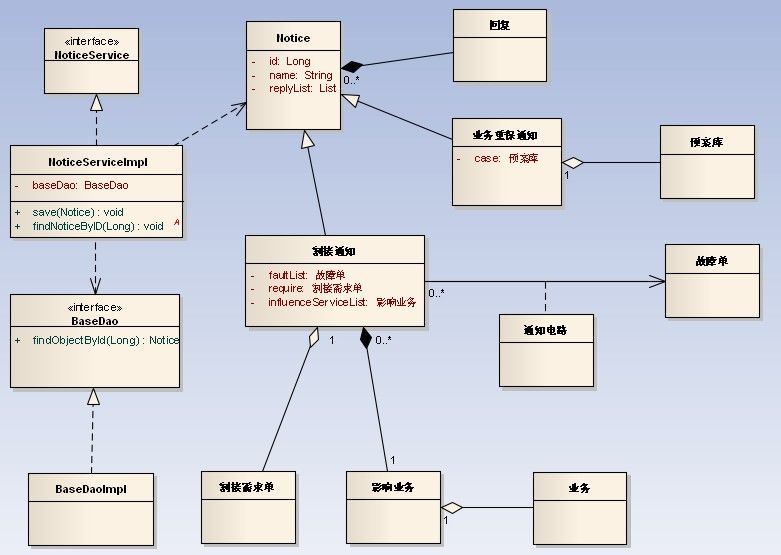 3. NoticeServiceImpl通过save方法的参数引用Notice,是依赖关系。同时调用了BaseDao完成功能,也是依赖关系。